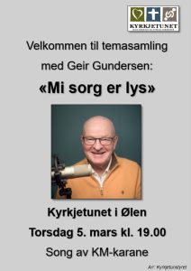 På temasamlinga på Kyrkjetunet 5. mars kl. 19.00 vil presten og forfattaren Geir Gundersen ta utgangspunkt i si eiga bok Mi sorg er lys. Gjennom boka skreiv han fram ei sorg som enno levde og brann medan orda tok form. Dette er ikkje ei bok skriven i etterpåklokskap eller på trygg avstand frå det smertefulle. Ho vart skriven midt i sorgprosessen – frå den sørgjande mannen sitt perspektiv. Han ville setja ord på det som skjer i eit menneske når livet brått blir annleis. Teksten ber preg av å vere både personleg og allmenn på same tid.
